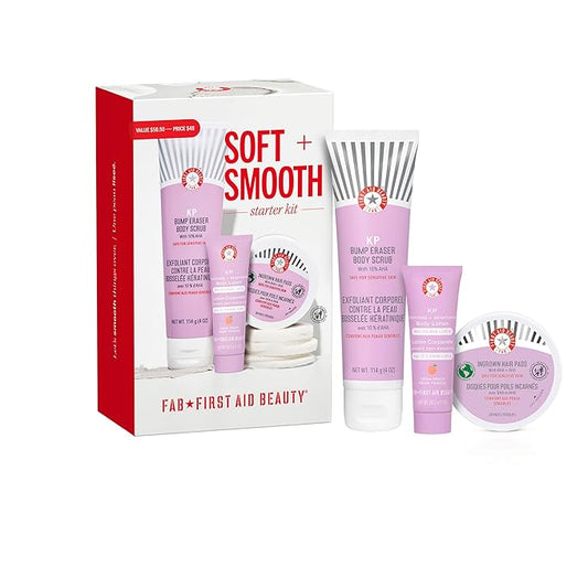 First Aid Beauty Soft + Smooth Starter Body Kit: KP Bump Eraser Body Scrub, 4 oz, Smoothing + Brightening Lotion (Peach), 1oz, & Ingrown Hair Pads, 28 Pads, Exfoliation & Hydrating Skin Care Set, 3ct