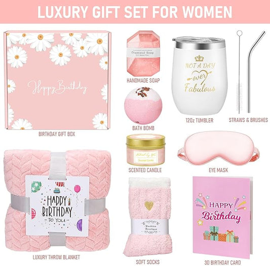 Birthday Gifts for Women Friendship, Happy Birthday Gifts Basket for Mom Friend Sister Wife Her Birthday Gift Unique, Luxury Self Care Gift Rose Relaxing Spa Gifts Set with 3D Birthday Card for Women