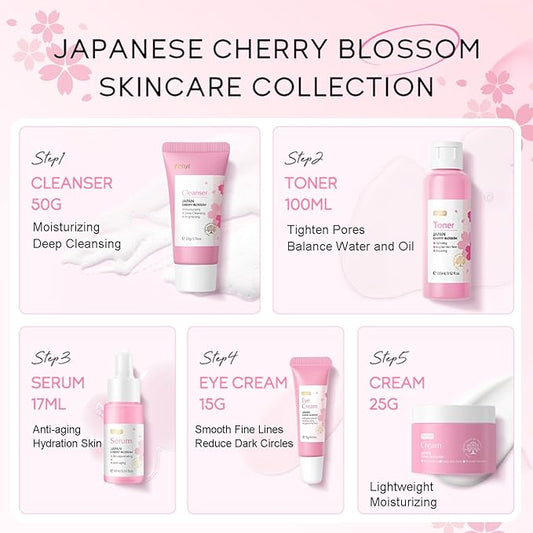 Skincare Set Japan Sakura Skin Care Set - Skincare Kits Gifts for Teen Girls, Travel Kit for Women Skin Care Routine Kit: Cleanser, Toner, Serum, Eye Cream, Face Cream, Beauty Christmas Gifts Set