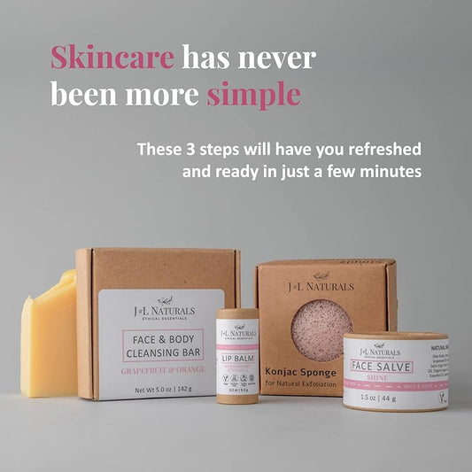 J&L Naturals Simple Skin Regimen Kit With Cleansing Bar, Face Salve, Konjac Sponge, Lip Balm | For Oily, Dry, Mature, and Combination Skin | Zero Waste (Shine (normal, dull skin), Simple)