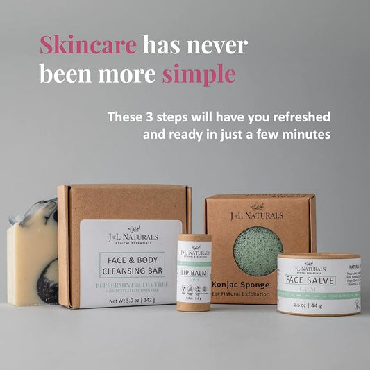 J&L Naturals Simple Skin Regimen Kit With Cleansing Bar, Face Salve, Konjac Sponge, Lip Balm | For Oily, Dry, Mature, and Combination Skin | Zero Waste (Balance (oily, combination skin), Simple)