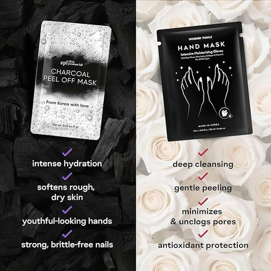 Hand Mask & Activated Charcoal Face Mask Skin Care Kit - Korean Skin Care Products Bundle for Face Skin Care & Dry Hands - Charcoal Face Mask & Hand Masks Moisturizing Glove Combo 12 pk for Spa Day