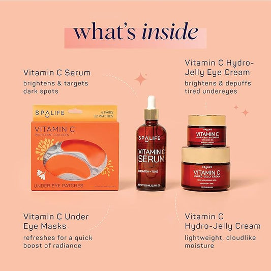 SpaLife Complete Vitamin C Skin Care Variety Bundle - Nourishing Under Eye Patches, Revitalizing Face & Eye Cream, and Potent Facial Serum for Youthful Radiance - Skincare Gift Set for Dry Skin