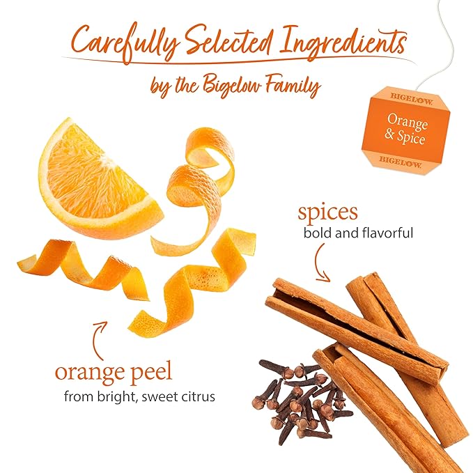 - Citrusy and Zesty: 120 tea bags of Bigelow Orange & Spice Herbal Tea, crafted with sun-kissed oranges and zesty spices making this invigorating herbal blend perfect for any time of the day