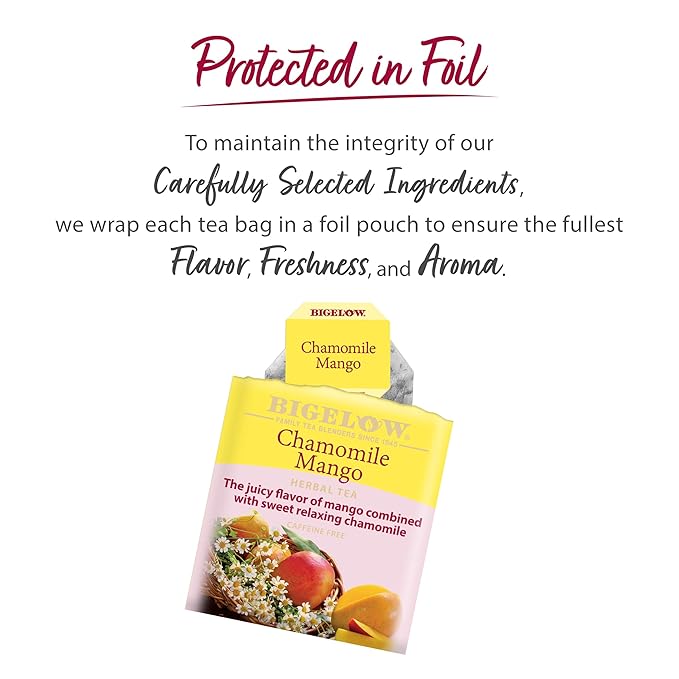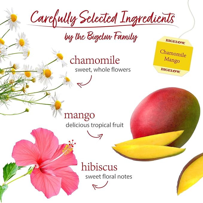 - Tropical Chamomile Mango: 120 tea bags of Bigelow Chamomile Mango Herbal Tea, a sweet and relaxing tea for a tropical experience right in your cup