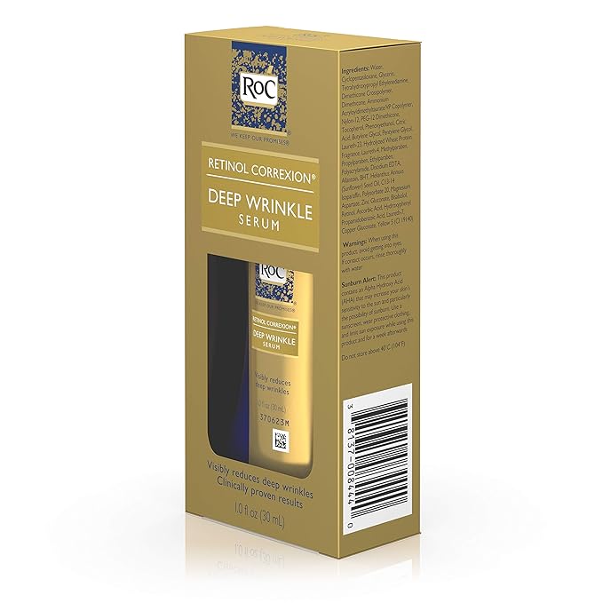 - 1-fluid ounce pump bottle of RoC Retinol Correxion Deep Wrinkle Anti-Aging Facial Serum designed to complement skin's renewal process and reduce the appearance of fine lines and wrinkles