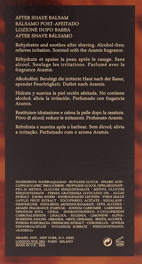- Scent : Aramis Advanced Moisturizing After Shave Balm