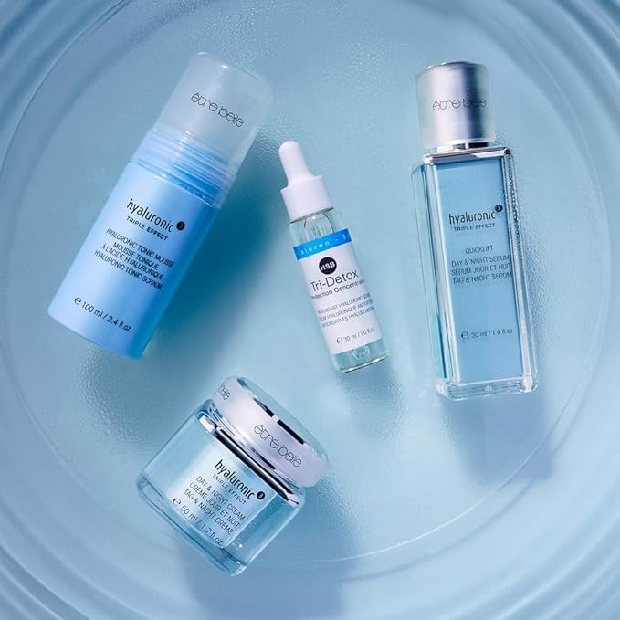 - 𝗜𝗻𝘁𝗲𝗻𝘀𝗲 𝗛𝘆𝗱𝗿𝗮𝘁𝗶𝗼𝗻 - The Hyaluronic³ Triple Effect Series by être belle features an advanced formulation of Hyaluronic Acid (HA) with three molecular weights. This innovative system delivers deep, multi-level hydration to combat signs of aging, smooth fine lines, improve your skin's elasticity, plump the skin, and restore lasting moisture for a rejuvenated, radiant complexion.