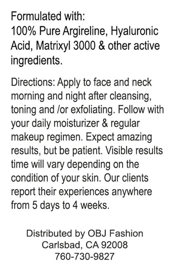 - Before and after pictures of women & celebrities who used the same ingredients: Argireline w/ Hyalurnoic Acid and Matrixyl 3000 Serum, and the results were really impressive. You will almost immediately see a change in your skin and an increase in your skin’s radiance.