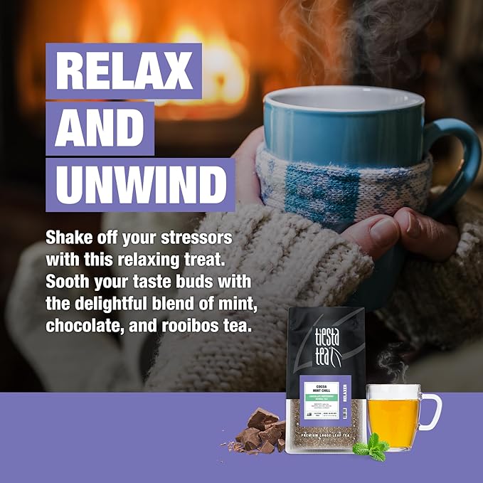 - CHOCOLATE PEPPERMINT FLAVOR FOR RELAXATION: Discover the smooth blend of chocolate and peppermint in Tiesta Tea’s Cocoa Mint Chill. This caffeine-free, chocolate mint tea is perfect for relaxing any time of day. Enjoy it hot or iced for a calming, dessert-inspired treat.