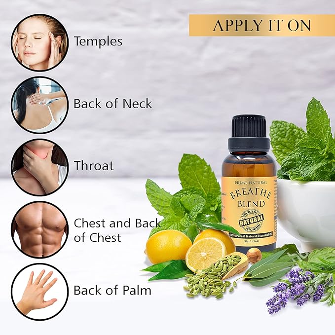 Prime Natural Breathe Essential Oil Blend 1oz - Pure, Undiluted, Therapeutic Grade for Aromatherapy, Scents & Diffuser - Sinus Relief, Allergy, Congestion, Cold, Cough, Headache