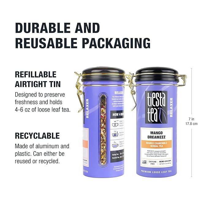 - REUSABLE TIN FOR FRESHNESS: Tiesta Tea's Mango Chamomile blend comes in a reusable tin, designed to keep your loose tea leaves fresh and flavorful. This refillable tin not only protects the tea but also makes a stylish, functional addition to any tea lover’s collection.