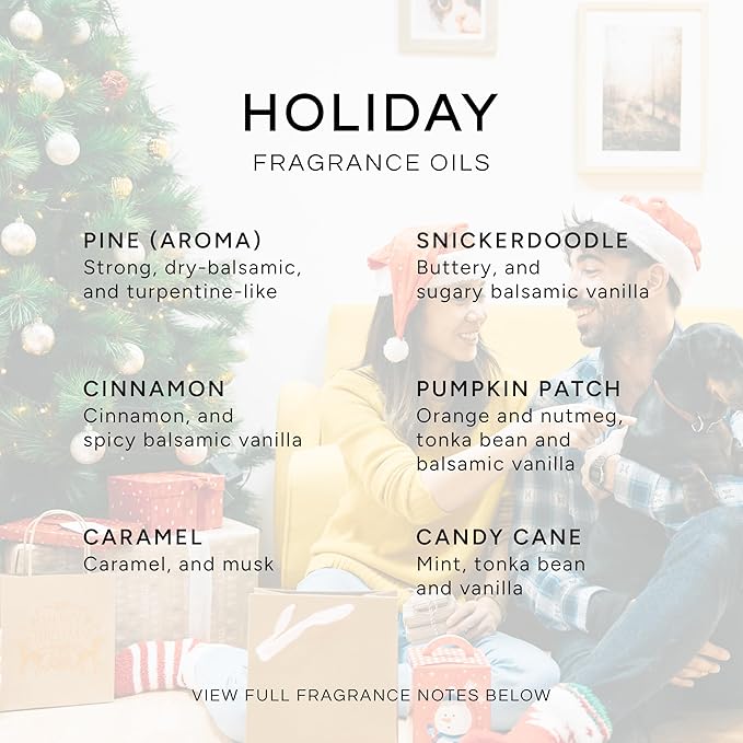 - HOLIDAY SCENTED OILS: Festive-smelling scents formulated for making candles, soaps, air freshener sprays, aromatherapy diffusers, dryer sheets and cleaning products. These seasonal essential scents make the perfect gift for the whole family!