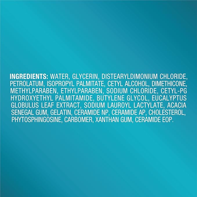 - Active Ingredients : carbomer,ceramide,cetyl alcohol,chloride,eucalyptus,glycerin,isopropyl palmitate,methylparaben,sodium chloride carbomer,ceramide,cetyl alcohol,chloride,eucalyptus,glycerin,isopropyl palmitate,methylparaben,sodium chloride