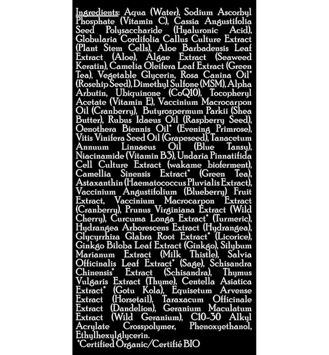 - Key Ingredients: All Natural & Certified Organic ingredients, including Plant Stem Cells, Vitamin C, MSM, hyaluronic acid and green tea.