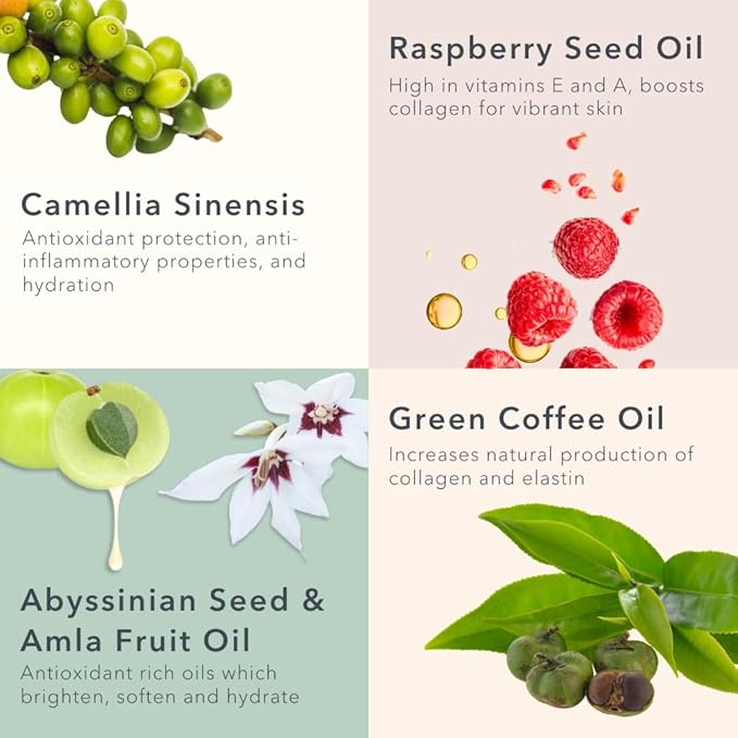 - MADE WITH PROVEN AND NATURAL INGREDIENTS: Our active components, which include Green Coffee Bean Oil, Abyssinian Oil, Evening Primrose Oil, and Raspberry Seed Oil, have been shown to work together to improve skin vitality. They will quickly and easily soak into your facial skin, reducing discolouration and enhancing elasticity. Rose extract increases radiance while Camellia seed oil, Borage seed oil, Macadamia nut seed oil, and Frankincense oils provide your skin with non-greasy moisture.