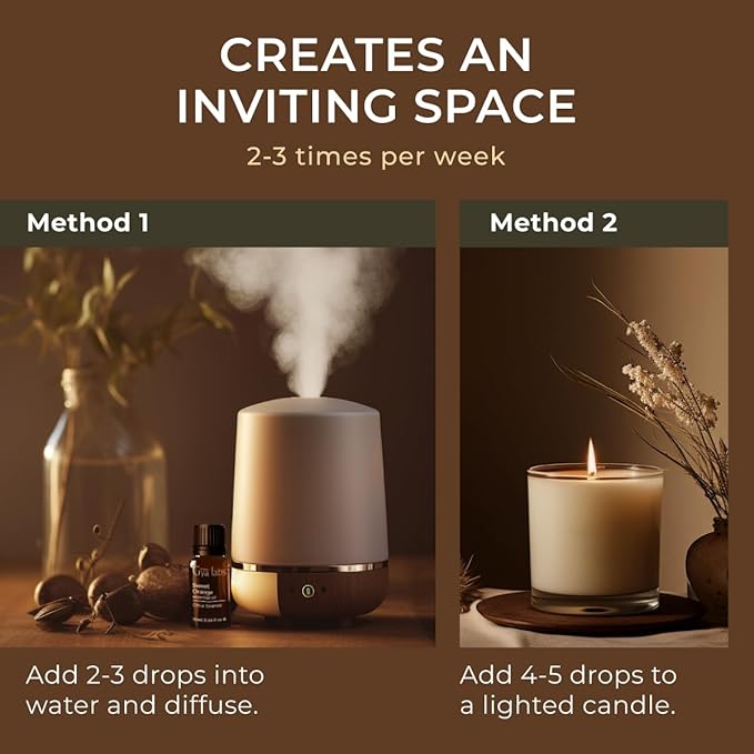 - A soothing & uplifting scent. Orange essential oil for diffuser elevates atmospheres with its refreshing and invigorating scent. Diffuse 2 drops of sweet orange essential oil in a diffuser to enjoy its sweet and citrusy aroma.