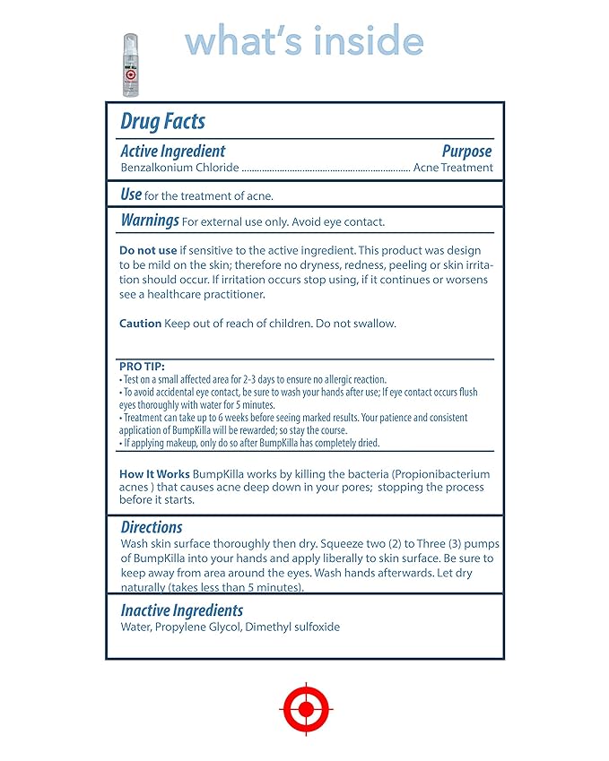 - BumpKilla Challenge - Get rid of 80% of your acne in 4 - 6 weeks or it's Free! The primary ingredient in BumpKilla is BenzalKonium Chloride. This ingredient has been approved for skin and food contact. It can be found in numerous products including mouthwashes, hand sanitizers and on condoms as a spermicide. In Bumpkilla it serves as the chief aid to stop the formation of acne. It is both safe and effective.If you have a Foamer bottle, don't forget to pickup the Refill [B07BGY28NV] and save.