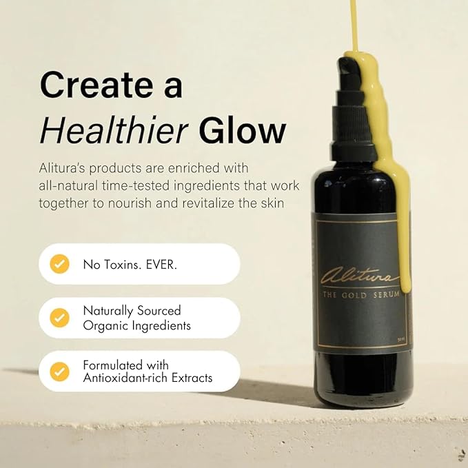 - The Only Face Serum You Will Ever Need: Made with 95% Organic Ingredients, The Alitura Gold Serum combines a beautiful symphony of nourishing Earth-Grown botanicals to improve the radiance and resilience of your skin. This facial serum effectively addresses a broad range of skin concerns.