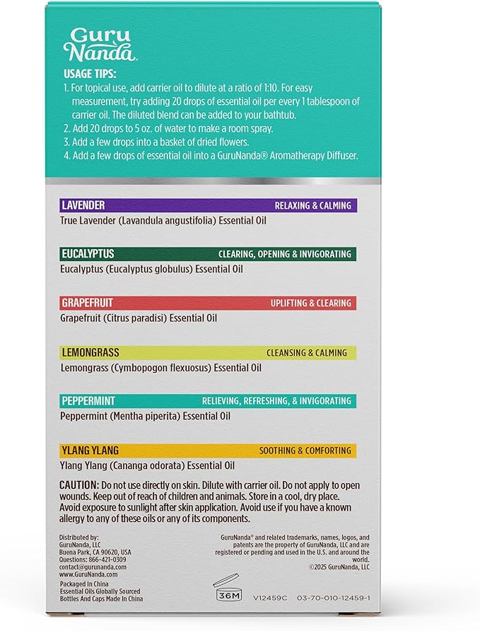 - GURUNANDA SET OF TOP 6 ESSENTIAL OILS: Elevate your mood with our 6 (variety of scents) most popular essential oils of 10ml each- Lavender, Peppermint, Eucalyptus, Lemongrass, Grapefruit & Ylang Ylang packed in amber bottles with leak-proof caps.