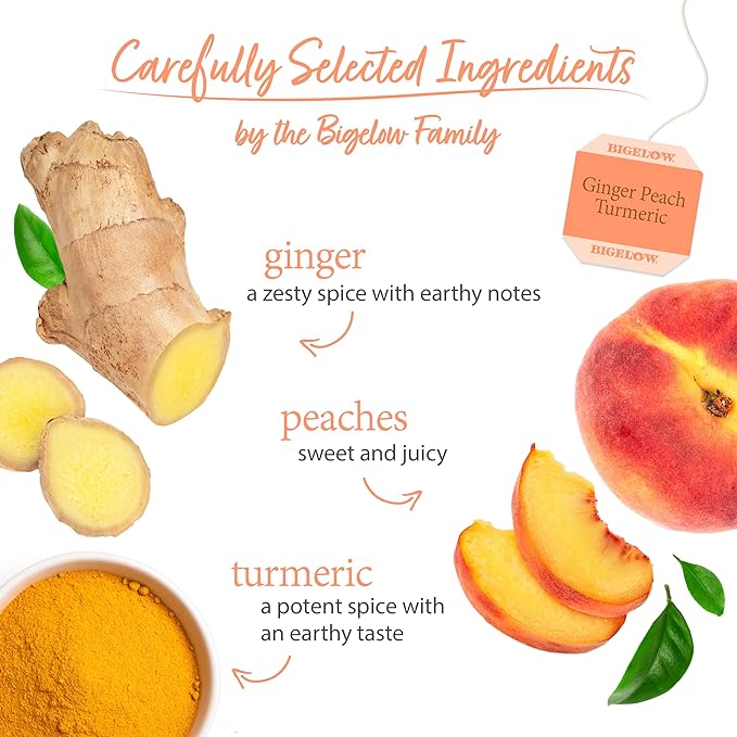 - Ginger Peach Turmeric: 108 tea bags of Bigelow Ginger Peach Turmeric Herbal Tea, an aromatic blend of ginger, peach and turmeric giving this tea a zesty spicy twist that invigorates the senses