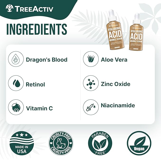 Hyaluronic Acid Wrinkle Serum, Vitamin C Serum for Face with Hyaluronic Acid, Retinol Serum for Face for Skin Elasticity, Fine Lines, and Dark Spots, Wrinkle Serum, 60-Day Supply TreeActiv