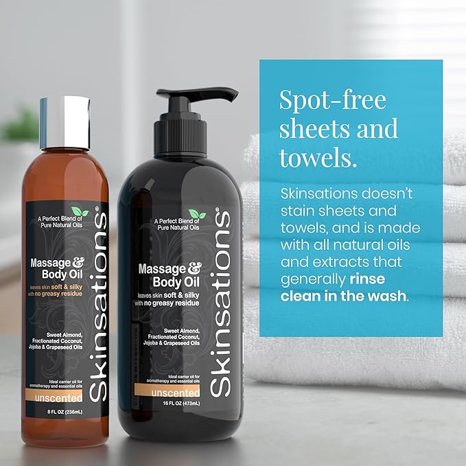 - Made and packaged in the USA – Money-back Guarantee! Skinsations is a natural massage oil, scented body oil and after shower oil moisturizer all-in-one!