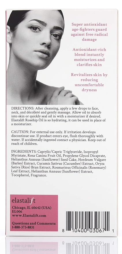 - Elastalift Rosehip Oil for face with Vitamin C and Cucumber. Pure Rosehip face oil helps with Wrinkles, Scarring, and Redness for a brighter skin complexion. 1.8 Fl Oz