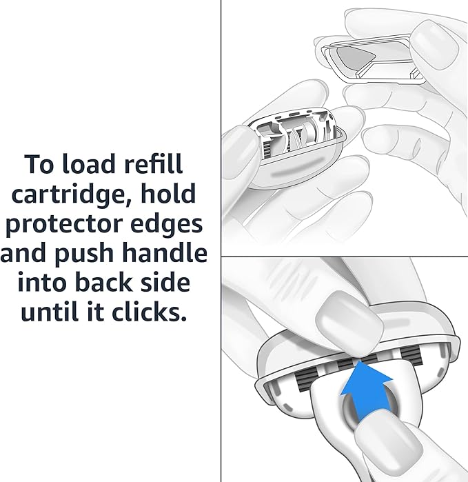 - To load refill cartridge, hold the larger half of the cartridge with blades facing down, remove plastic top, and push razor into the back of cartridge until it clicks
