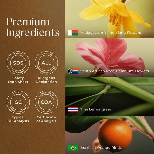 - Essential oils set made with botanicals. This wholesome blend is crafted with an infusion of Ylang Ylang Essential Oil, Rose Geranium Essential Oil, Sweet Orange Essential Oil and Lemongrass Essential Oil.