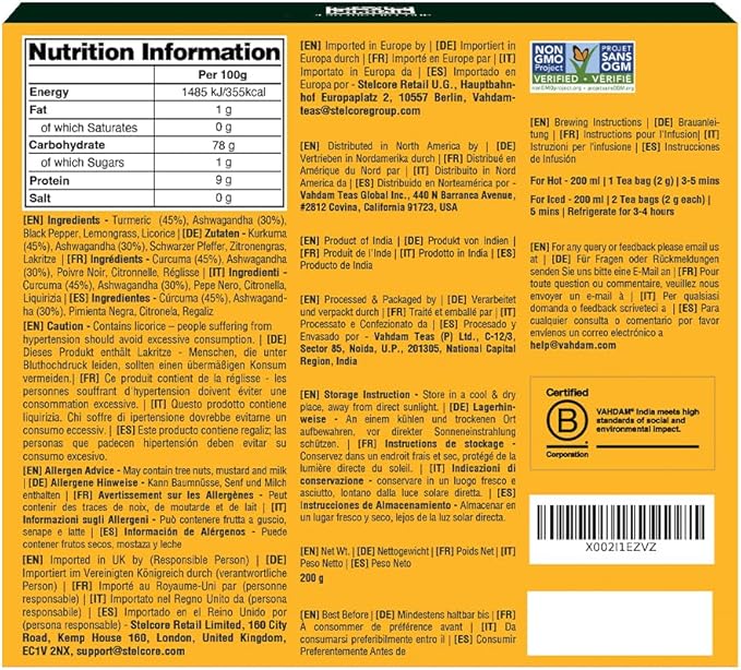 VAHDAM, Turmeric Ashwagandha Herbal Tea Bags (100 Count) Caffeine Free, Non GMO, Gluten Free | 100% Pure Herbal Blend - Sweet & Earthy | Whole Leaf Tea Bags | Resealable Ziplock Pouch