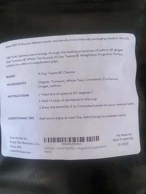 FIRE TEAS - 14 DAY TEA CLEANSE - Organic Turmeric (Curcumin), Ginger, White Peony Tea, Cardamom, Cinnamon, Hibiscus & Saffron - 20 Times More Anti Oxidants - Manufactured in the USA