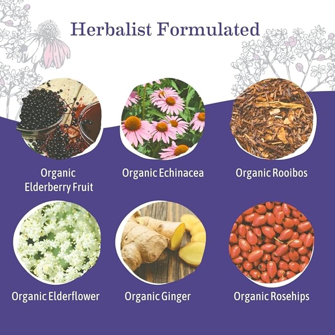 - SIPS OF PROTECTION: Earth Mama’s Organic Elderberry Immune Tea is packed with precisely blended herbs, including echinacea, rooibos, and ginger, that support a healthy immune system.