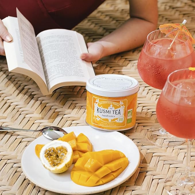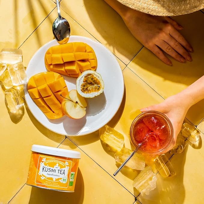 Kusmi Tea - AquaExotica - Organic Blend of Hibiscus, Mango, Dragon Fruit & Apple - Caffeine Free Herbal Tea - Enjoy Hot or Iced - Loose Leaf Tea - Tin Box of 3.5 oz - Quantity for about 50 cups