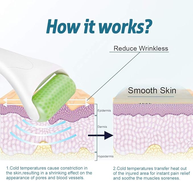 - 1)Wake Your Skin: Morning, when you feel puffiness on the face and eye, by gently using the ice roller on your skin, the frozen roller can quickly shrink pores and promote blood circulation. The puffiness of the eyes and face can quickly disappear, and the dark circles and bags under the eyes caused by poor sleep quality can be effectively relieved.