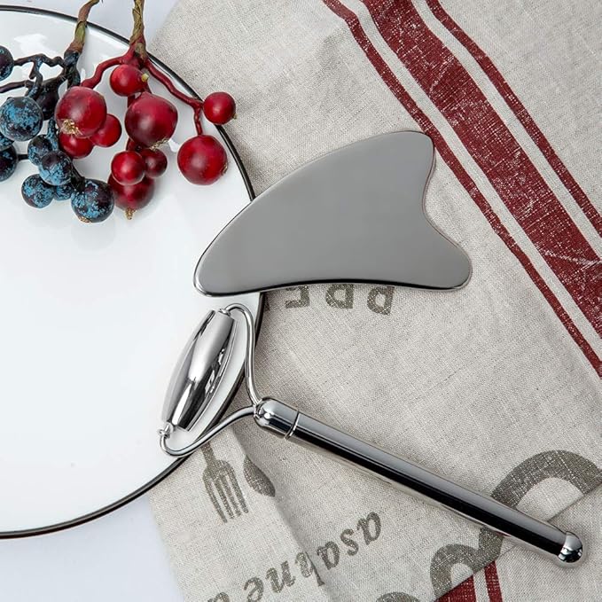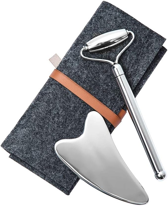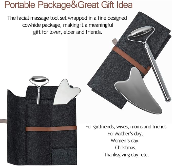 - π Sturdy&safe stainless steel material: Made of premium top quality stainless steel material, the facial massage tools set is perfect for doing facial SPA. The material itself says for durability and easy cleanup. The smooth edges and curves of the roller and scraper ensure gently touching your skin without hurting while massaging your face accurately