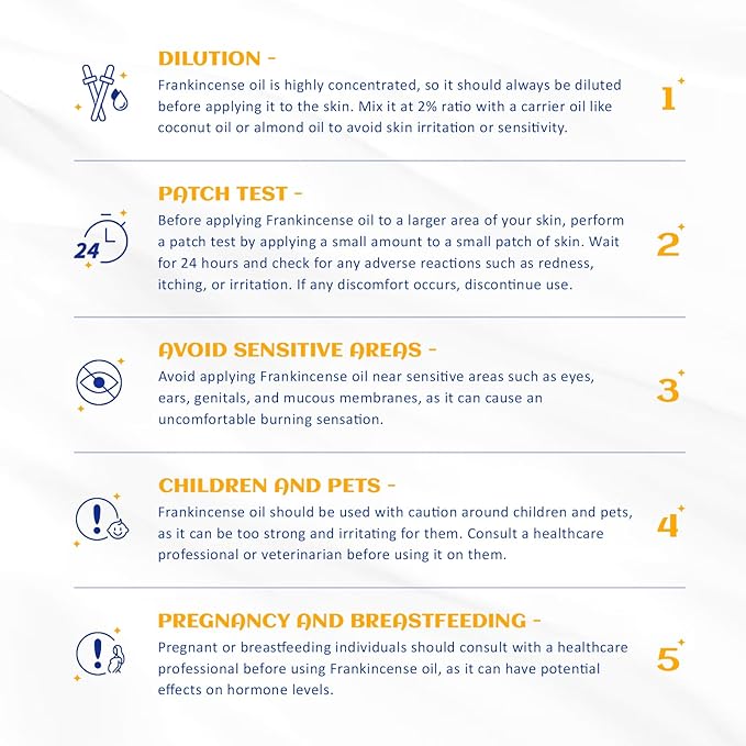 - Body Massage: Dilute 1 drop of frankincense essential oil with 10 to 20 drops of a carrier oil (Sweet Almond, Grapeseed or Jojoba). Take an appropriate amount of the blended oil on your palm and apply the oil in a circular motion on the body parts that need to be massaged, which can relax the body and mind