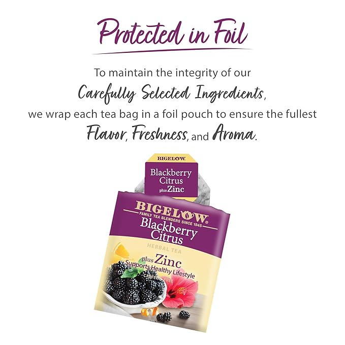 - Blackberry Citrus with Zinc: 108 tea bags of Bigelow Blackberry Citrus Plus Zinc Herbal Tea, a herbal blend of sweet and tangy blackberry flavor with a hint of juicy citrus provides a delicious way to include zinc as part of your daily routine