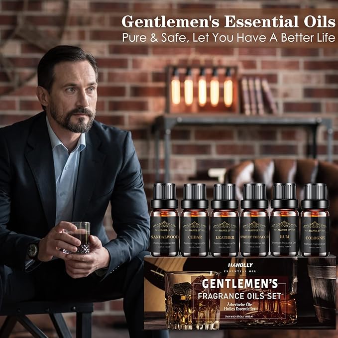 - Set of 6 Men's Fragrance Oils: This is a well-curated collection of masculine scents that include 6 bottles of essential oils with manly scents - Sandalwood, Cedar, Leather, Sweet Tobacco, Rum, Cologne aromatherapy oils. The classic fragrance of an elegant gentleman can invoke a wide variety of pleasant associations and begin a special scent journey.