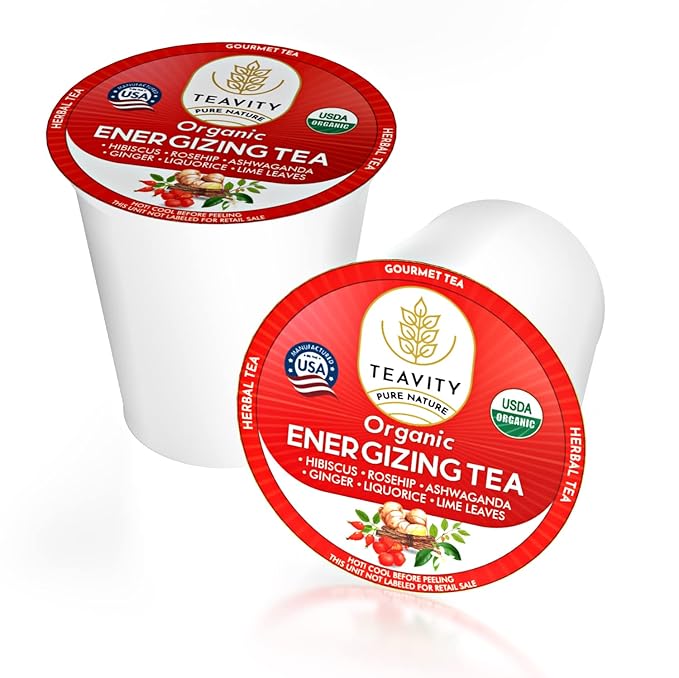 - Organic Ashwagandha Tea Pods for Keurig with Ginger, Licorice, Organic Hibiscus Sabdariffa, Rosehip, and Lime.Naturally Decaffeinated Energizing Herbal Tea blend, crafted to provide a natural energy boost.