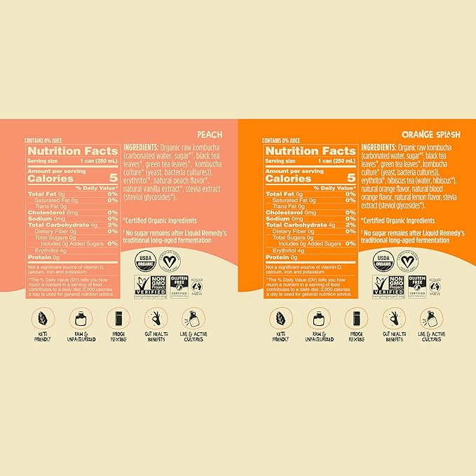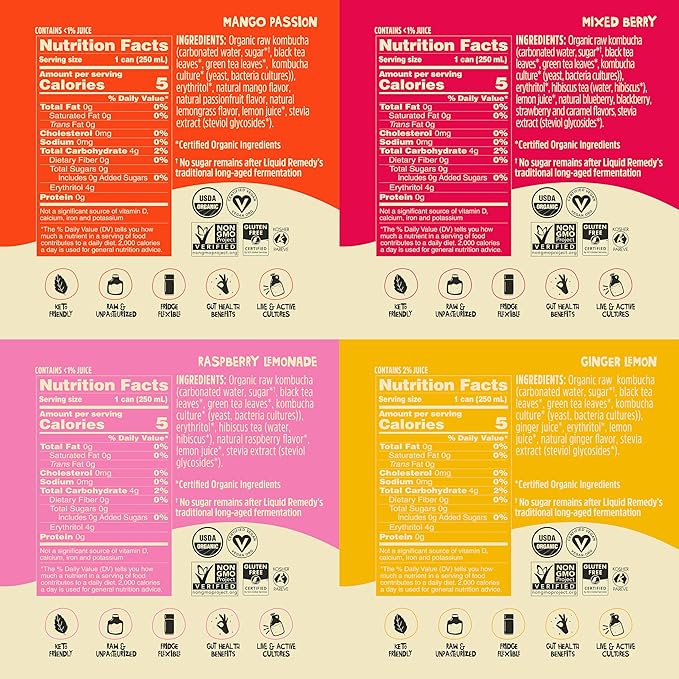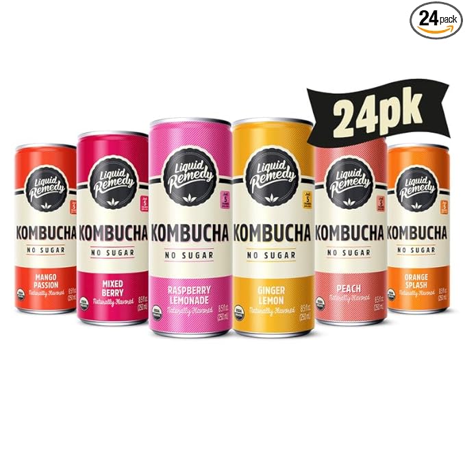Liquid Remedy Kombucha Sugar Free Organic Drink, Low Calorie, Probiotic Like Tea for Gut Health - Super Sampler Variety Pack - 8.5 Fl Oz Can, 24-Pack