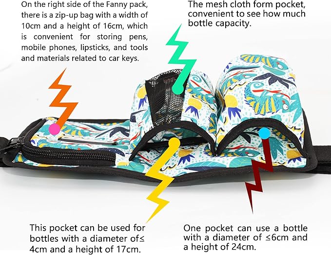 - 3、design: A: The design of the bag has A total of 4 separate pockets, the front has two large pockets and A small hidden pocket can be temporarily used for different capacity bottle, two large pockets available diameter ≤2.36inch 9.45inch high bottle, one of the mesh cloth form pocket, convenient to see how much bottle capacity; Another small hidden pocket can be used for the diameter ≤4cm, 17cm high bottle;