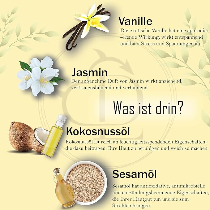 - OUR SECRET: Exotic Vanilla Has An Aphrodisiac Effect, Also It Is A Relaxant And Reduces Stress And Tension. The Pleasant Aroma Of Jasmine Brings Attraction, Confidence, And Connectedness. This Blend Of Essential Oils Helps You To Relax And Lifts Your Mood.