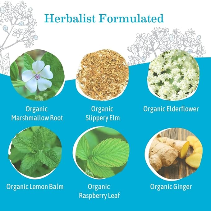 - SIPS OF COMFORT: Earth Mama’s Organic Throat Soothie Tea features an exclusive herbal blend including organic slippery elm, organic lemon balm, and organic elderflower, with a delicate lemony flavor that’s gentle yet effective when throats need a little extra love.