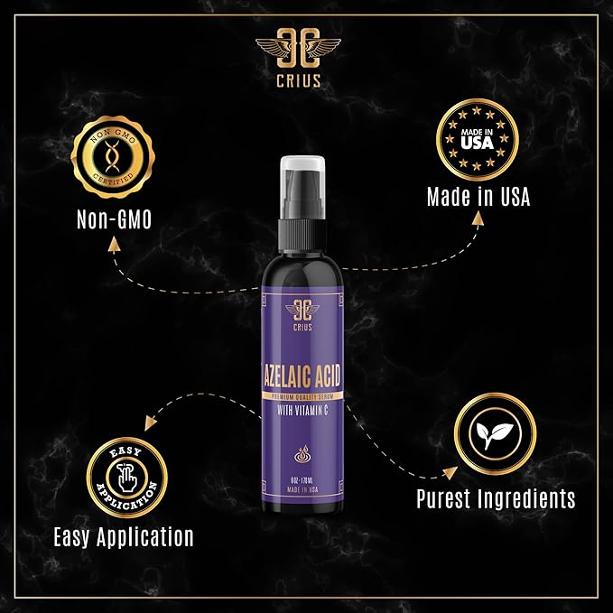 - Illuminate Your Skin: Unveil a radiant and even complexion with our Azelaic Acid Facial Serum infused with Vitamin C. This powerful serum targets blemishes and discoloration, helping to fade acne marks and restore skin's inner luminosity.