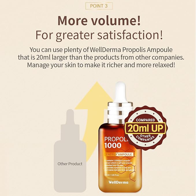 - ✔️ WITH CONSISTENT USE, WELLDERMA Propolis 1000 Energy Ampoule can help improve the overall health and appearance of your skin, leaving you with a more youthful, glowing complexion. ✔️ ADVANCED FORMULA and SUPERIOR RESULTS, WELLDERMA Propolis 1000 Energy Ampoule is a must-have addition to any skincare routine. Try it today and discover the difference for yourself!