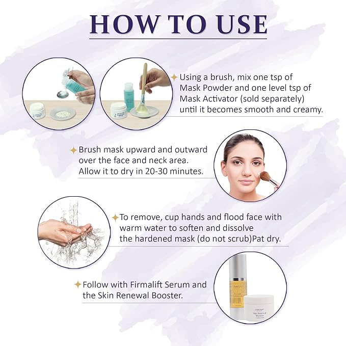 - HOW TO USE: Using a brush, mix one heaping tsp. of Mask Powder and one level tsp. of Mask Activator (sold separately) until it becomes a smooth and creamy consistency. Brush mask upward and outward over the face and neck area. Allow it to dry in 20-30 minutes. To remove, cup hands and flood face with warm water to soften and dissolve the hardened mask (do not scrub). Pat dry. Follow with Firmalift Serum and the Skin Renewal Booster.