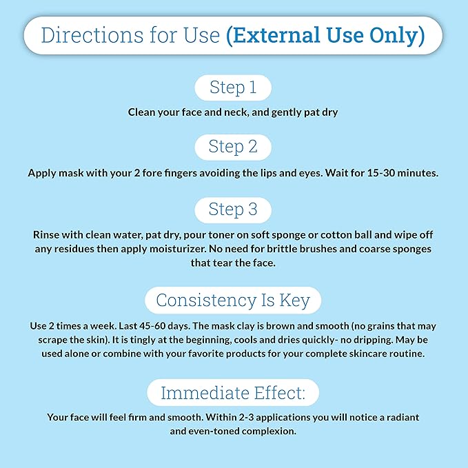 - CONSISTENCY IS KEY-Repeat 2 times a week. Last 45-60 days. The masque clay is brown and smooth (no grains that may scrape the skin). It is tingly at the beginning, cools and dries quickly so there is no dripping. Use it alone or combined with other products of your choice for a complete skin care routine. Not for sensitive skin