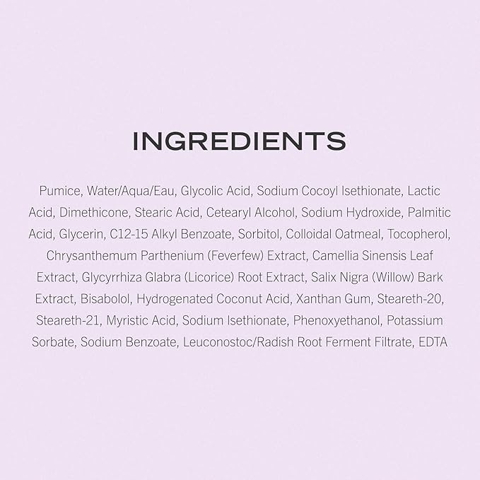 - Buff Away Dead Skin: Glycolic & Lactic acids, at a combined level of 10% AHAs, to help resurface skin’s top layer + pumice to physically exfoliate, helping improve skin’s texture and smooth away bumps, roughness, and scaly areas, also known as chicken skin + buttne