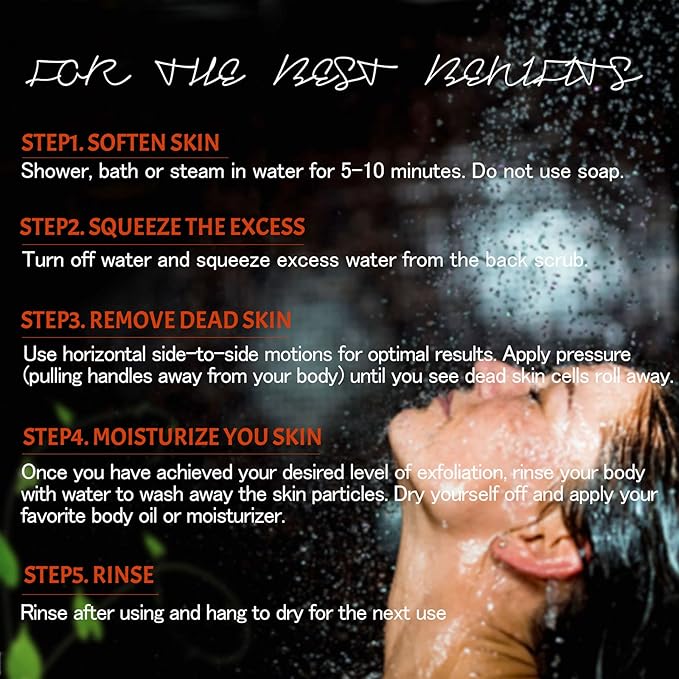 - Remove Dead Skin Easily with Only Water: soak in hot water for at least 5-10 minutes to soften your skin and open up the pores , then the large straps pulling the handles away from your body.Also use to help with self tanning & it works perfectly